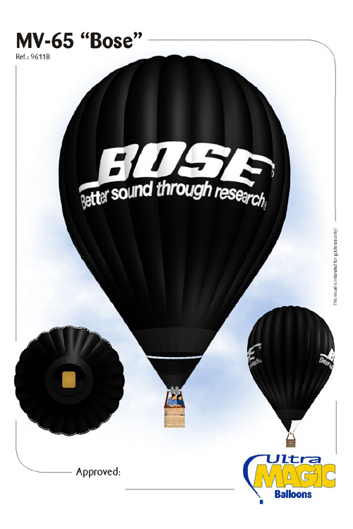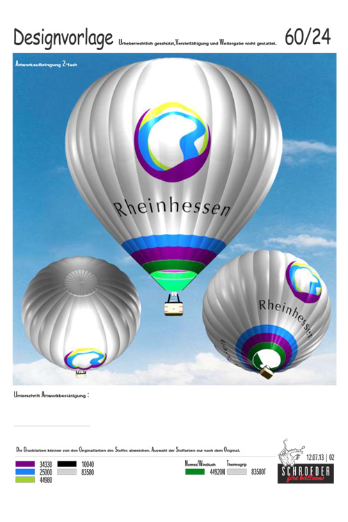 Beim Betrachten des Ballons ist nur ein Hüllensegment mit einem Zentrierwinkel von weniger als 180° einzusehen. Aus diesem Grund empfiehlt es sich, gegebenenfalls das Logo 3x nebeneinander umlaufend auf der Hülle anzubringen.